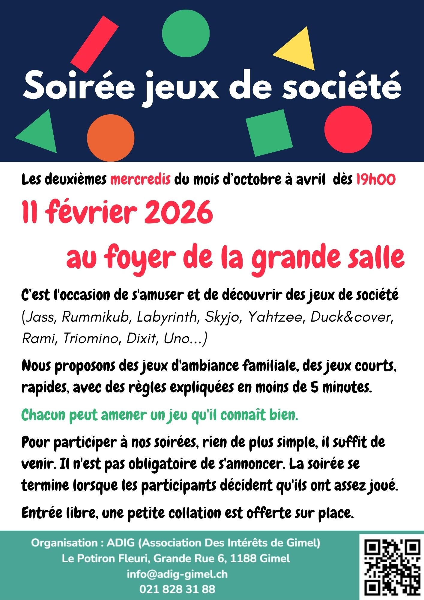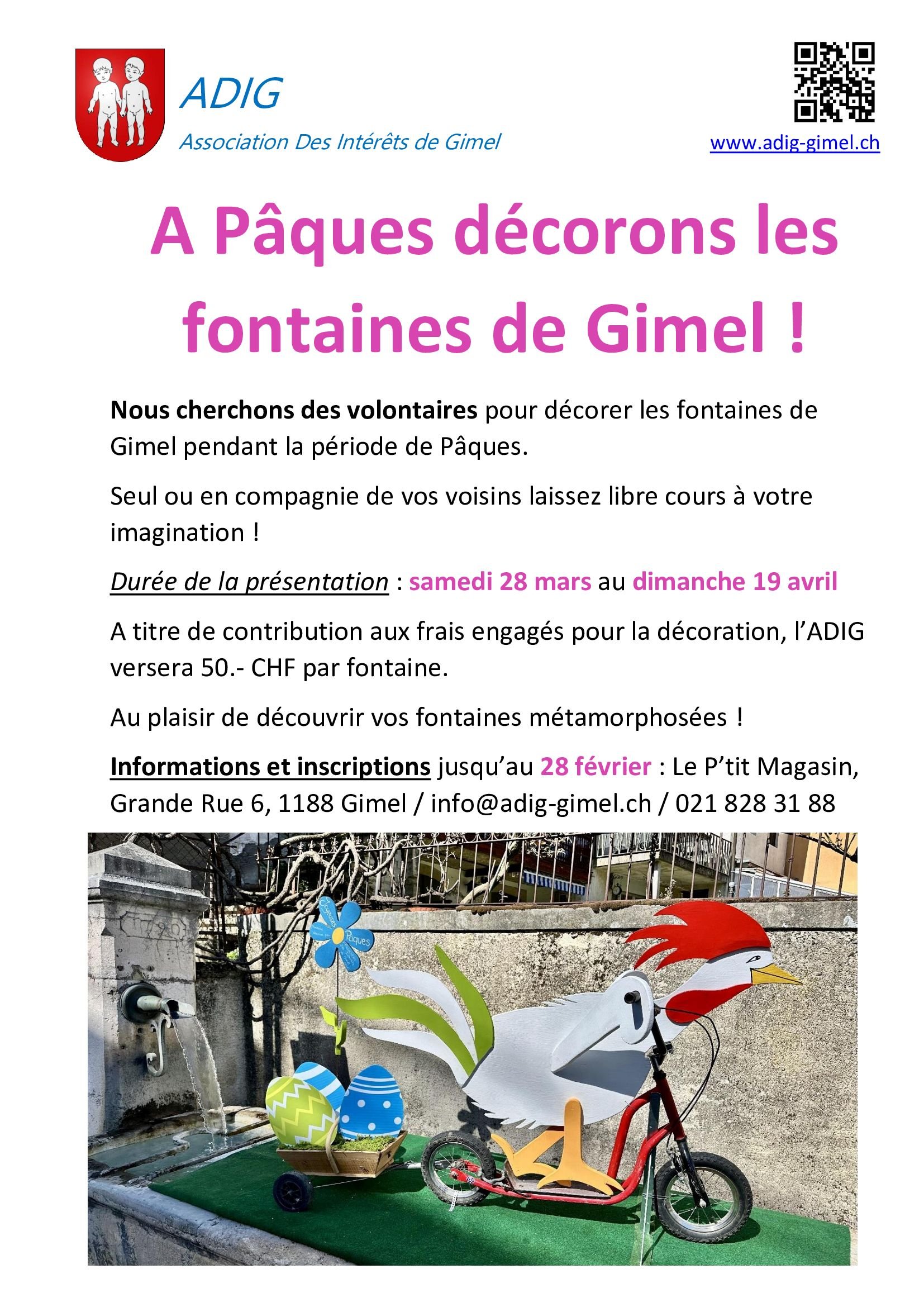 Informations et inscriptions jusqu'au 28 février au P'tit Magasin (info@adig-gimel.ch / 021 828 31 88)